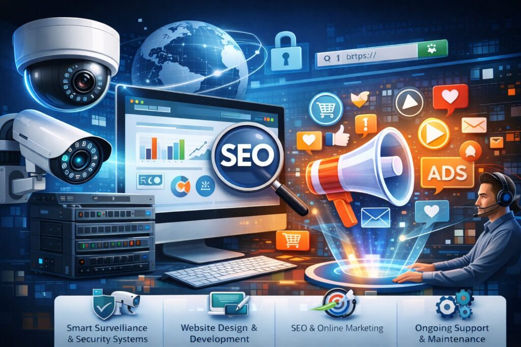 We provide complete technology solutions designed to protect, promote, and grow your business or property. Our services include smart surveillance systems with high-definition CCTV, NVR units, and Wi-Fi cameras, along with professional website designSEO, and digital marketing services built to increase visibility and conversions. From secure system installations and remote monitoring to high-performance websites and targeted online campaigns, we deliver reliable, modern solutions for both residential and commercial needs—backed by expert support and seamless integration.